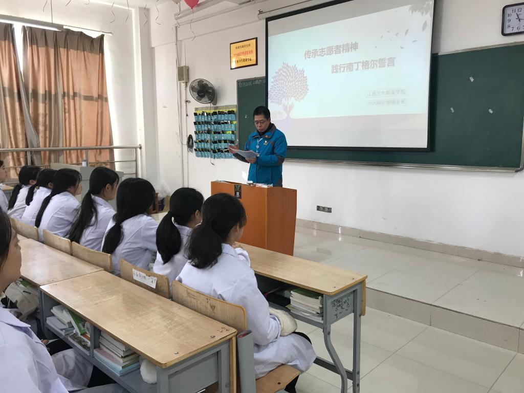 12月31日,2020级护理精业班开展“传承志愿者精神 践行南丁格尔誓言”特色主题班会。学院党委委员、纪检书记、护理系特色班思想导师彭世球,护理系党总支书记朱福良应邀参加。