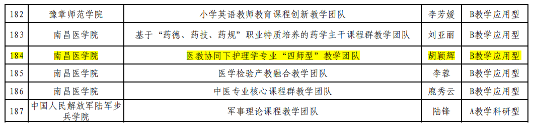 近日,江西省教育网上公示,jdb电子jdb电子游戏官方网站胡颖辉教授牵头的《医教协同下护理学专业“四师型”教学团队》获得江西省高水平本科教学团队(B教学应用型)立项。2022年全省高校共评选出187个高水平本科教学团队,jdb电子共4个教学团队获批立项建设。