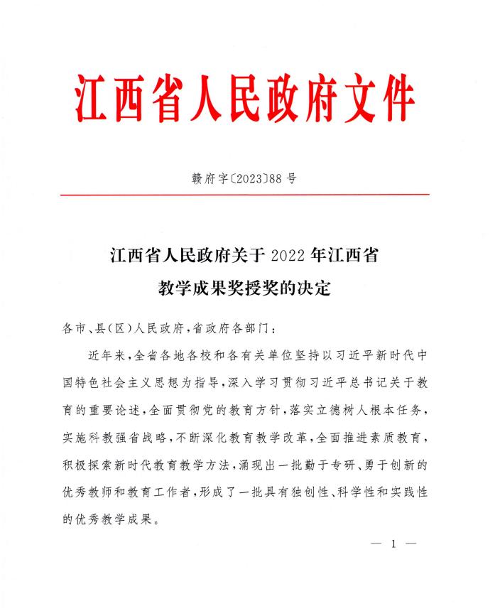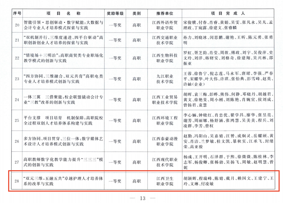 近日,江西省人民政府发布了《江西省人民政府关于2022年江西省教学成果奖授奖的决定》(赣府字〔2023〕88号),jdb电子游戏官方网站胡颖辉副院长主持申报的《“双元三维,五融五共”卓越护理人才培养体系的改革与实践》获得2022年江西省教学成果一等奖。