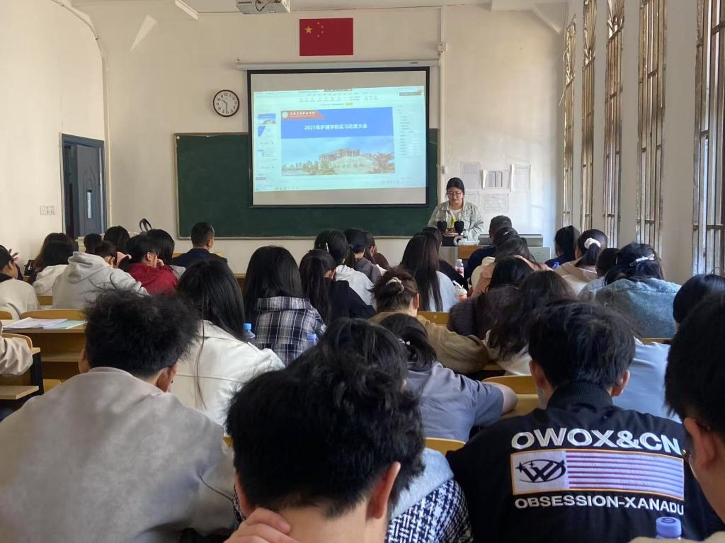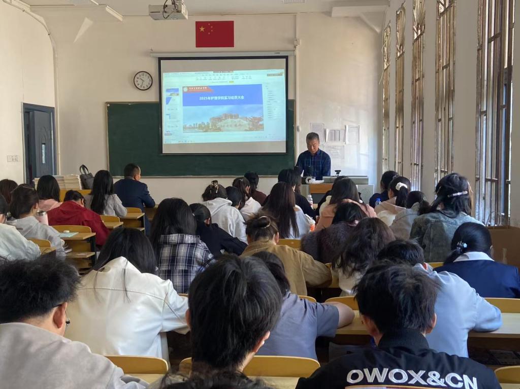 大会开始,王向东发表实习动员讲话,他在实习动员中强调:一、要守牢一个底线,关注“习讯云”考勤打卡平台,注意实习安全;二、做好两项准备,即专升本和护考;三、完成实习、就业、考试三大任务;四、完成四项要求。通过结合丰富的案例分享,以及树立榜样的力量,王向东以贴近学生、生动有趣的方式提醒同学们学会转变角色,加强理论与实践学习,注意实习安全。