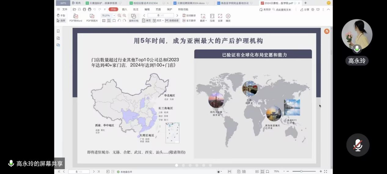 贝康国际负责人高永玲简单介绍了贝康国际的发展历程以及目标愿景,通过陈述贝康国际现有的人力和物力资源向同学们展示了一个多样化的产后护理机构,并通过就业者的工作环境、职场成长以及薪酬收入三个角度展现贝康国际环境舒适、职场氛围融洽、薪资丰厚的特点。同时公司拥有“透明晋升”规划,使学生能够纵向专业线深造。丰富的讲解吸引大家踊跃提问,会后共有18名同学向贝康国际投递了简历。